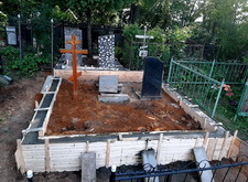 Затем наступил самый ответственный этап работы: монтаж ограждение. Работа по его установке опять-таки заняла достаточно долгое время, однако в результате чего по периметру могилы была установлена достаточно высокая статусная металлическая ограда, сразу же выделяющая место захоронения на фоне других участков. На фотографиях ниже представлен окончательный внешний вид могилы с разных ракурсов на момент завершения работ.
